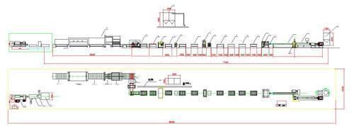 نظام تغذية/ آلة بثق أولى/ مبادل تعشيق هيدروليكي/ آلة بثق ثانية/ قالب/ جهاز معايرة/ وحدة نقل بالدحرجة أولى/ آلة القطع الطولي/ وحدة نقل ثانية/ نظام المراقبة/ نظام تعبئة و تغليف/ أجهزة ثانوية